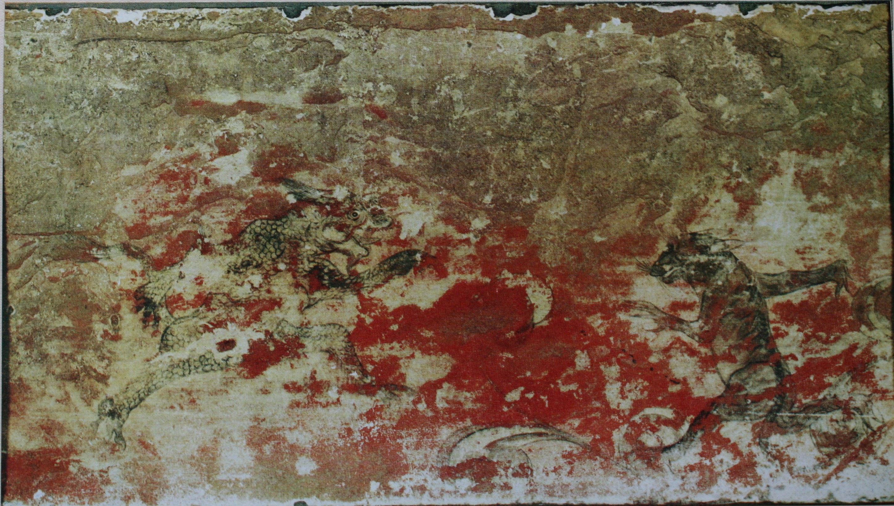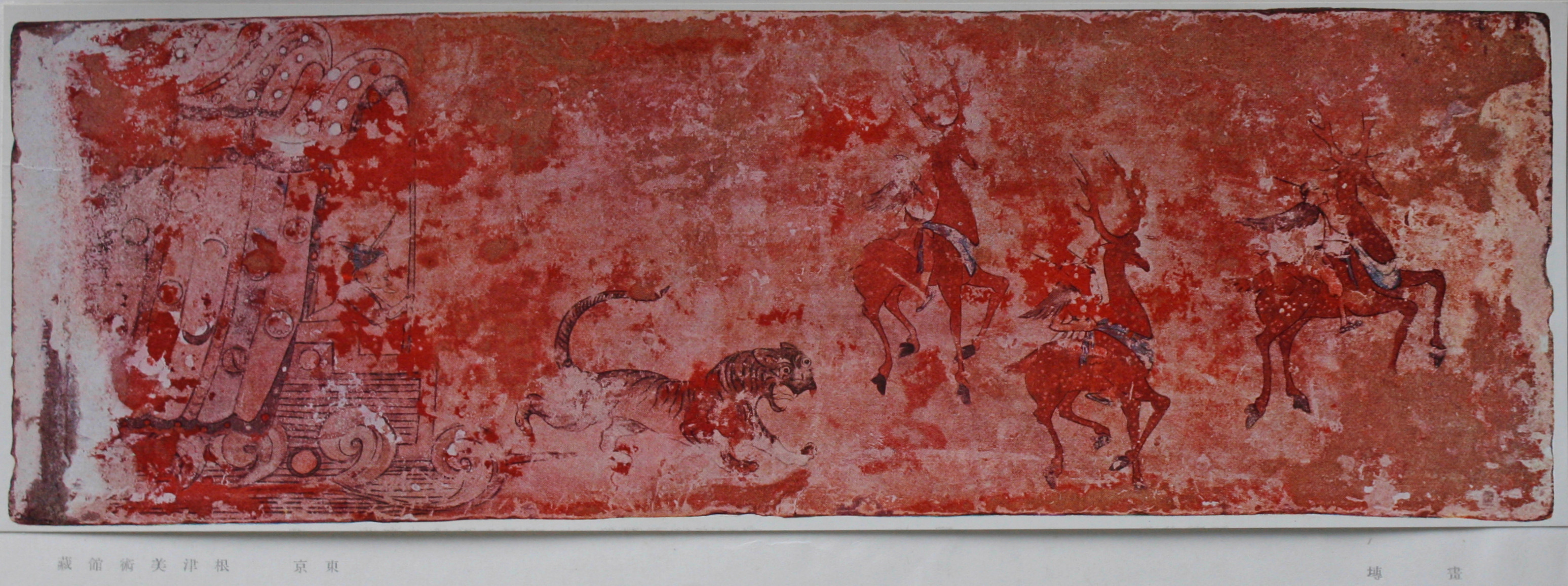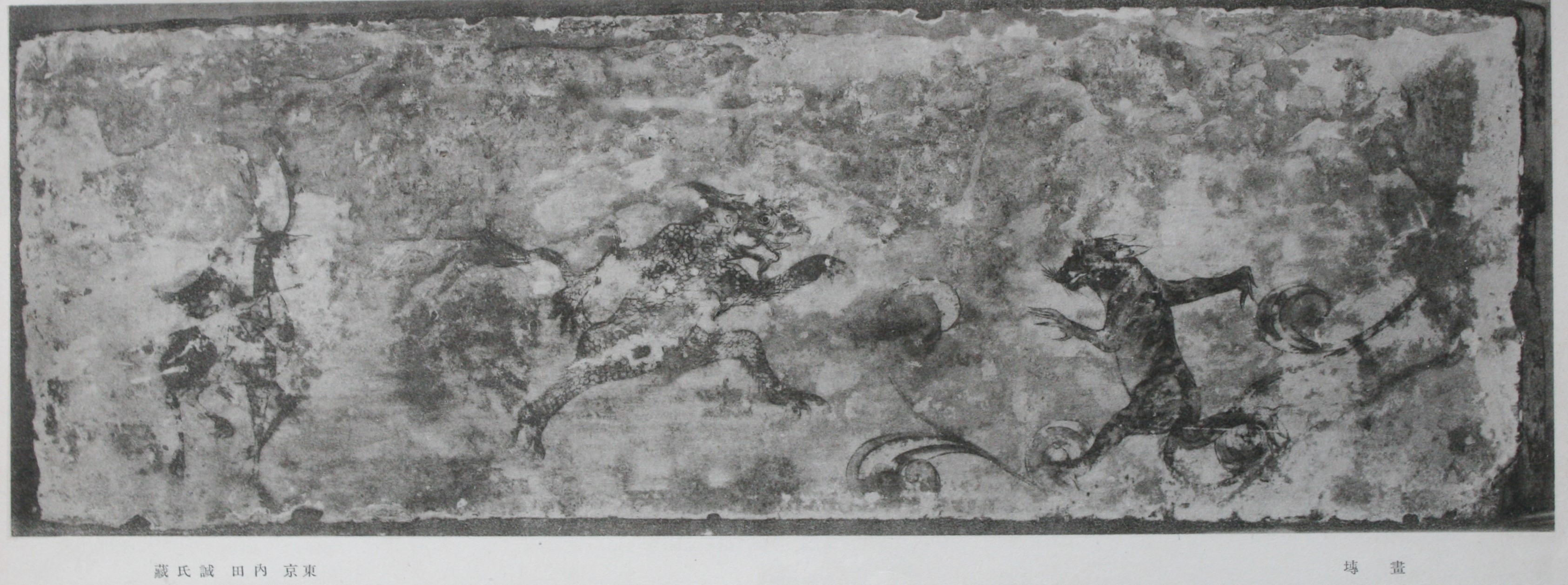 There are two dynasties Painting in Japan, which are paintings with color and ink on funeral bricks. One is 69.5x23cm in NEZU MUSEUM, Tokyo, and another is in TENRI Gallery in Nara(67.8x23cm). Both were imported in Japan in 1920s. These are belong to a set with three paintings block in British Museum, which Sueji Umehara suggested(Ref1) The set suggested mystic world scenes after death. The Brick in Tenri Gallery has a singular scene: mystic monsters battle scene. I feel it rare. Most real mural paintings in Ancient China were pageant of the deceased as bureau officers or scenes of theatre despite Ma -Wang-Tui banners.