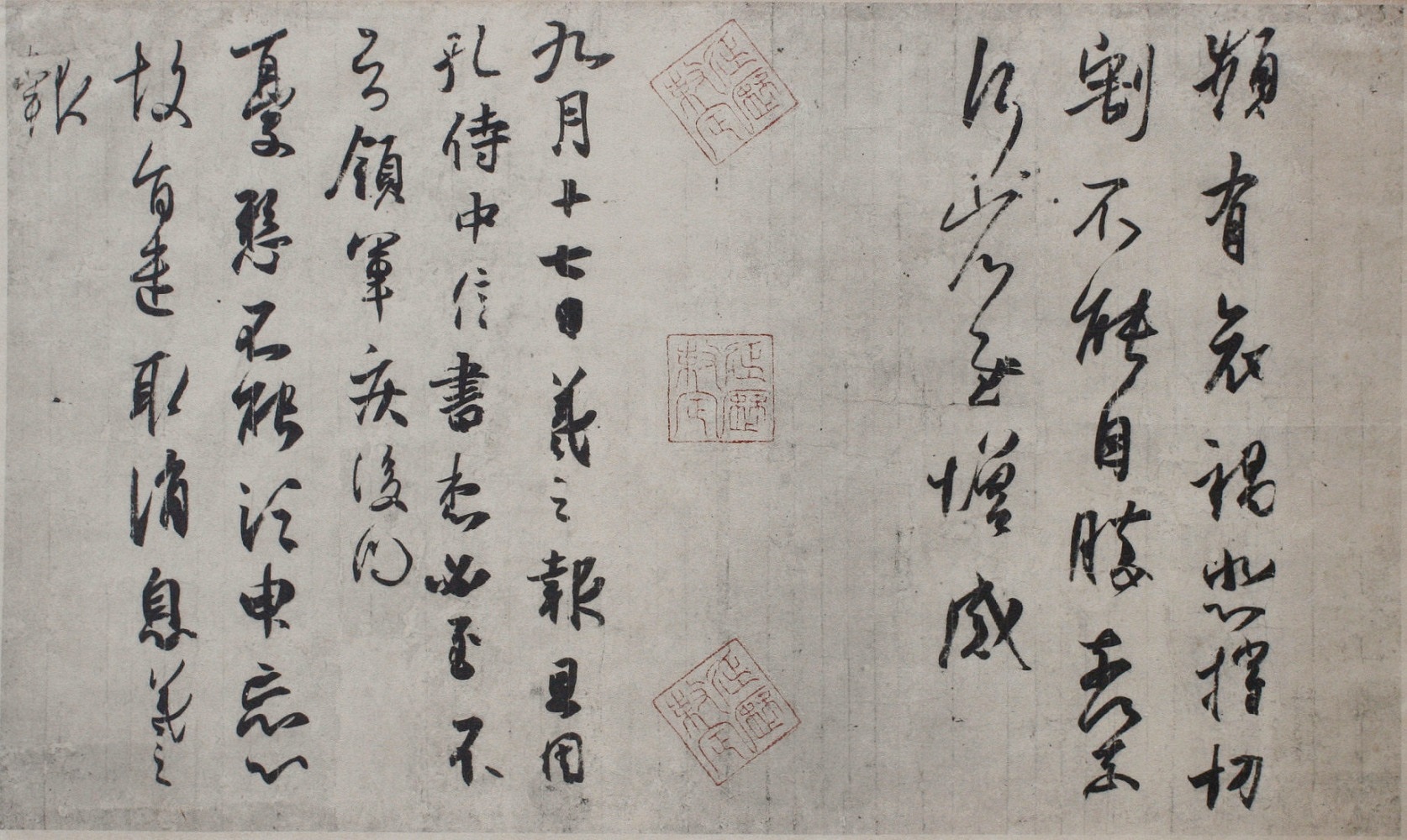 喪乱帖より傷んでいて、表面の劣化がうかがわれる。実見したが、ガラス越しの観察よりも、よい写真図版のほうが細かいところまでよくみえるように思った。